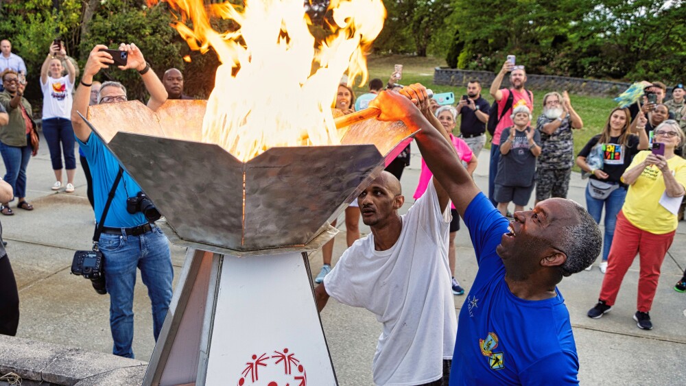 Law enforcement officers, known as the Guardians of the Flame, carry the Special Olympics Torch, symbolizing the Flame of Hope, through communities to the Opening Ceremonies of various Special Olympics events.